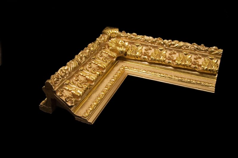 Основа – сосна обыкновенная. Лепной орнамент из мастики и гипса. Комбинированное декоративное покрытие: поталь и имитация матового золочения бронзовым порошком.